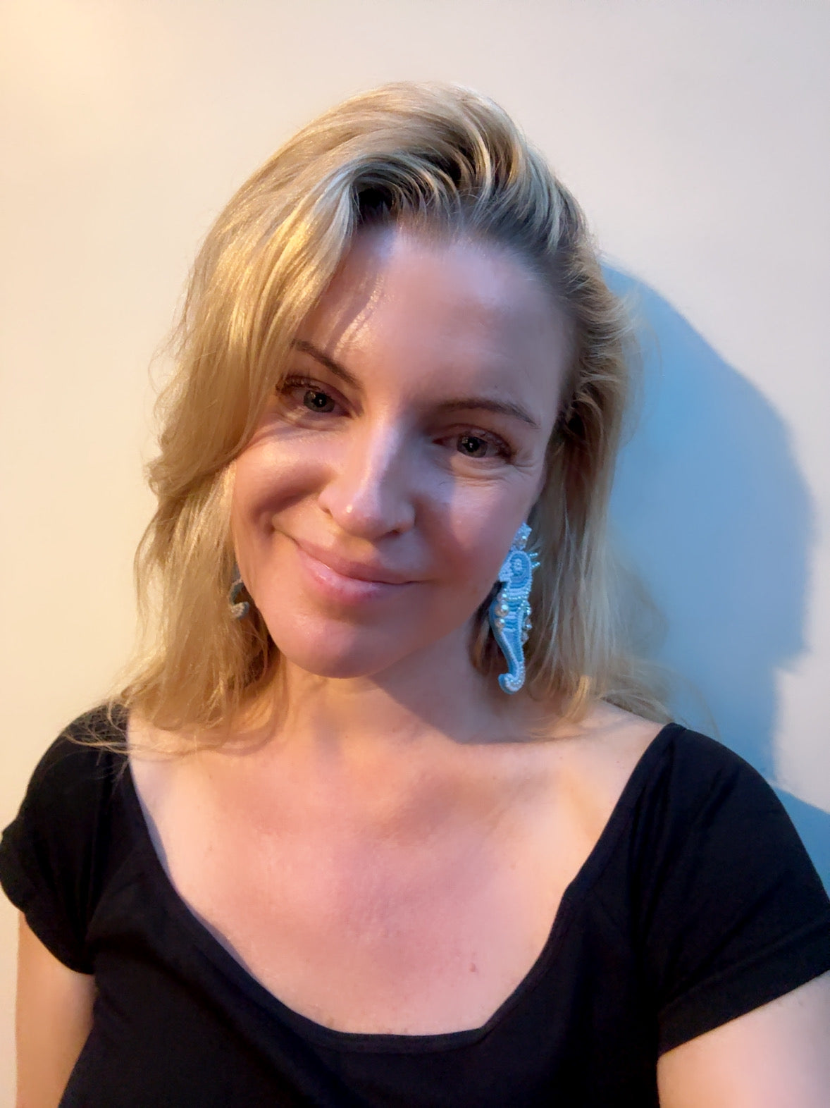 Boucles d'oreilles en perles de rocaille en forme d'hippocampe bleu faites à la main