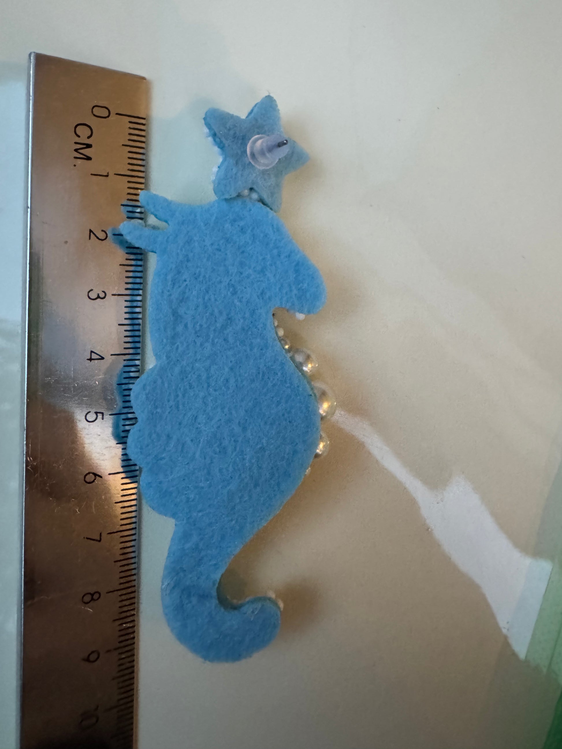 Boucles d'oreilles hippocampe bleues et blanches en perles de rocaille, faites main. Ornées de perles et de strass. Dos en feutre. Fermoir à tige. Légères et confortables.