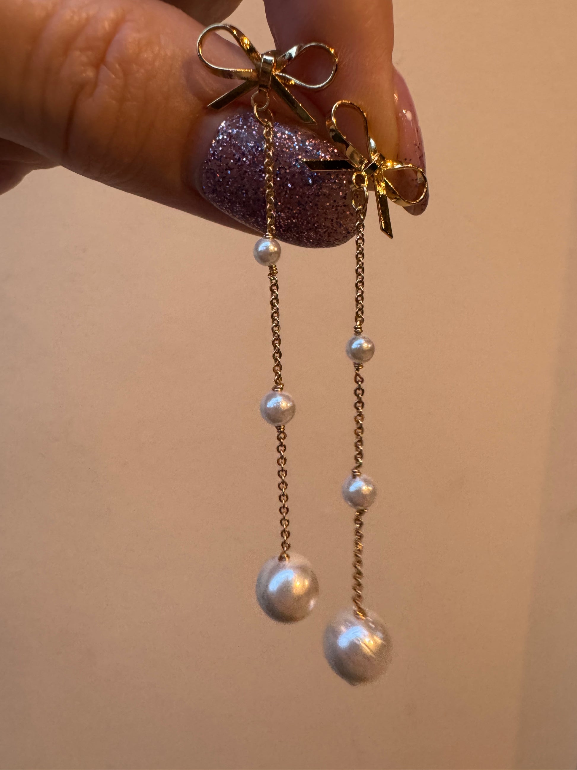 ハンドメイドのパールとゴールドのリボンのイヤリング。軽い着け心地です。
