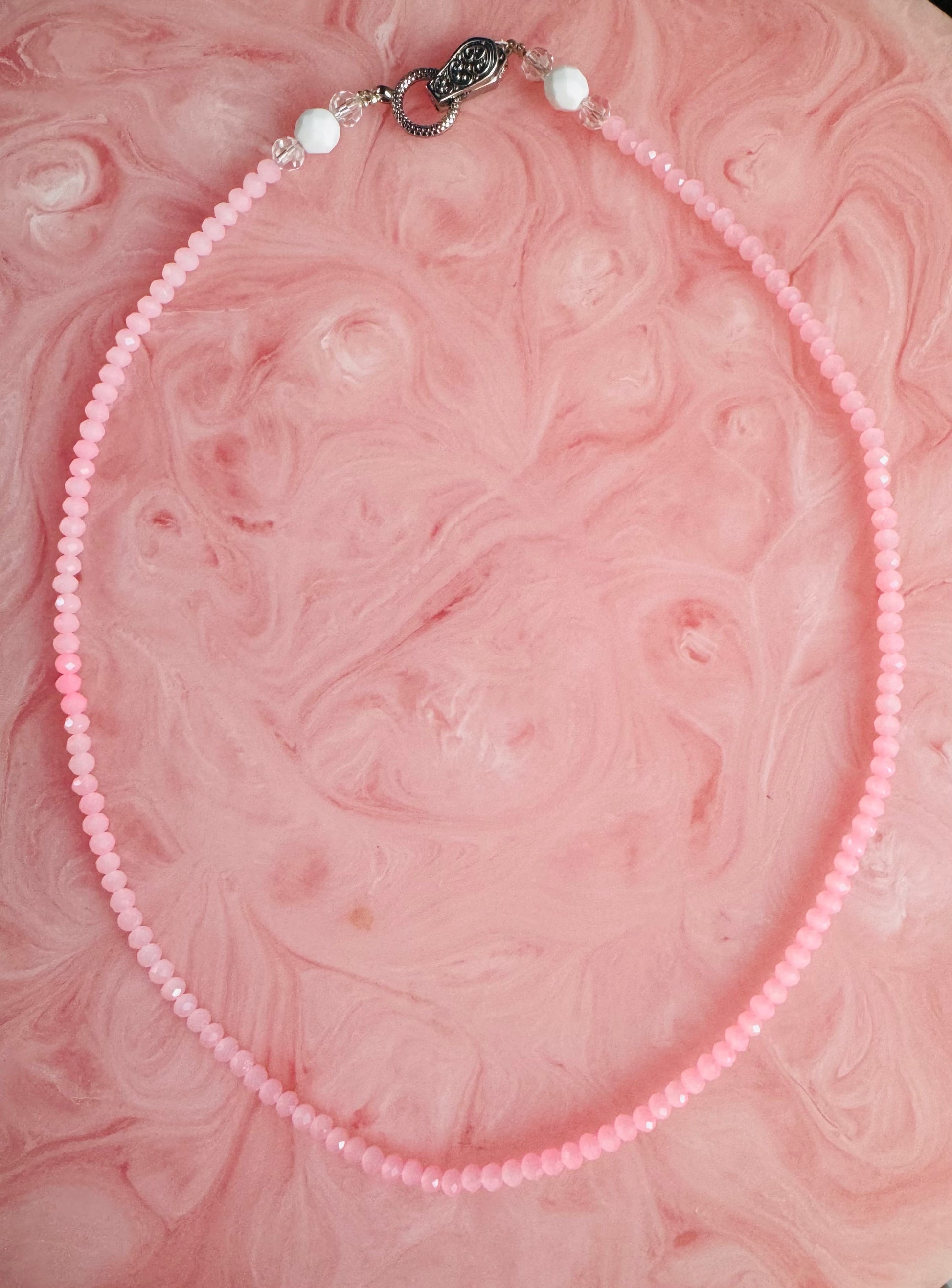 鮮やかなピンク色のビーズをあしらった、ハンドメイドのファンタジーネックレス。本物のスワロフスキークリスタルと、開閉しやすいシルバーの留め金が特徴です。ブレスレットとしてもお使いいただけます。