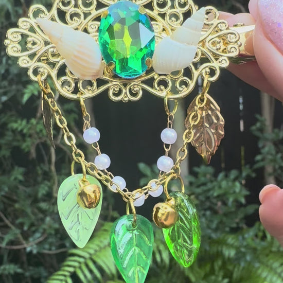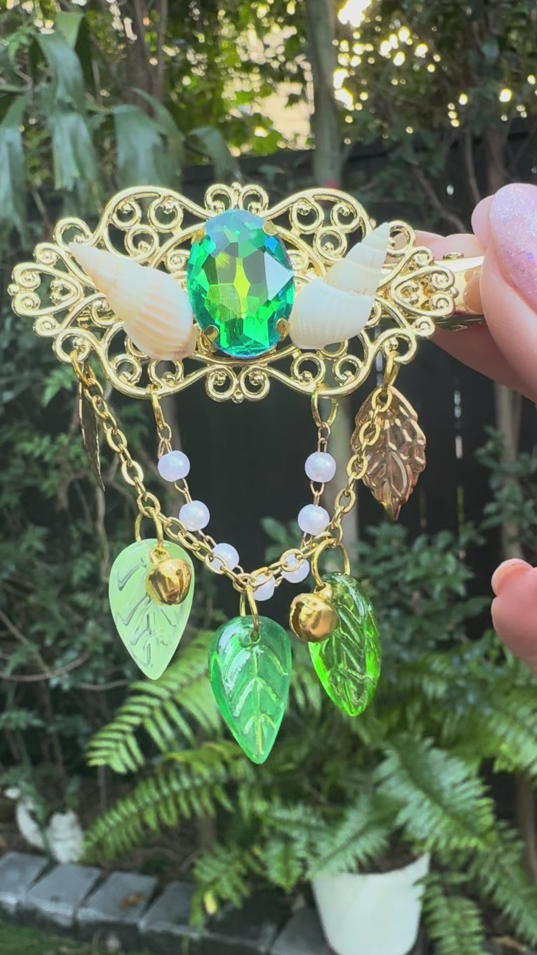 A lush, enchanting piece inspired by ocean depths and wild green coves. Mermaid’s Treasure features shimmering glass leaves and rich green tones, set against radiant 14K gold plating. Handmade in Australia, this fantasy hair clip is a one-of-a-kind statement for dreamers, wanderers, and sea spirits alike.