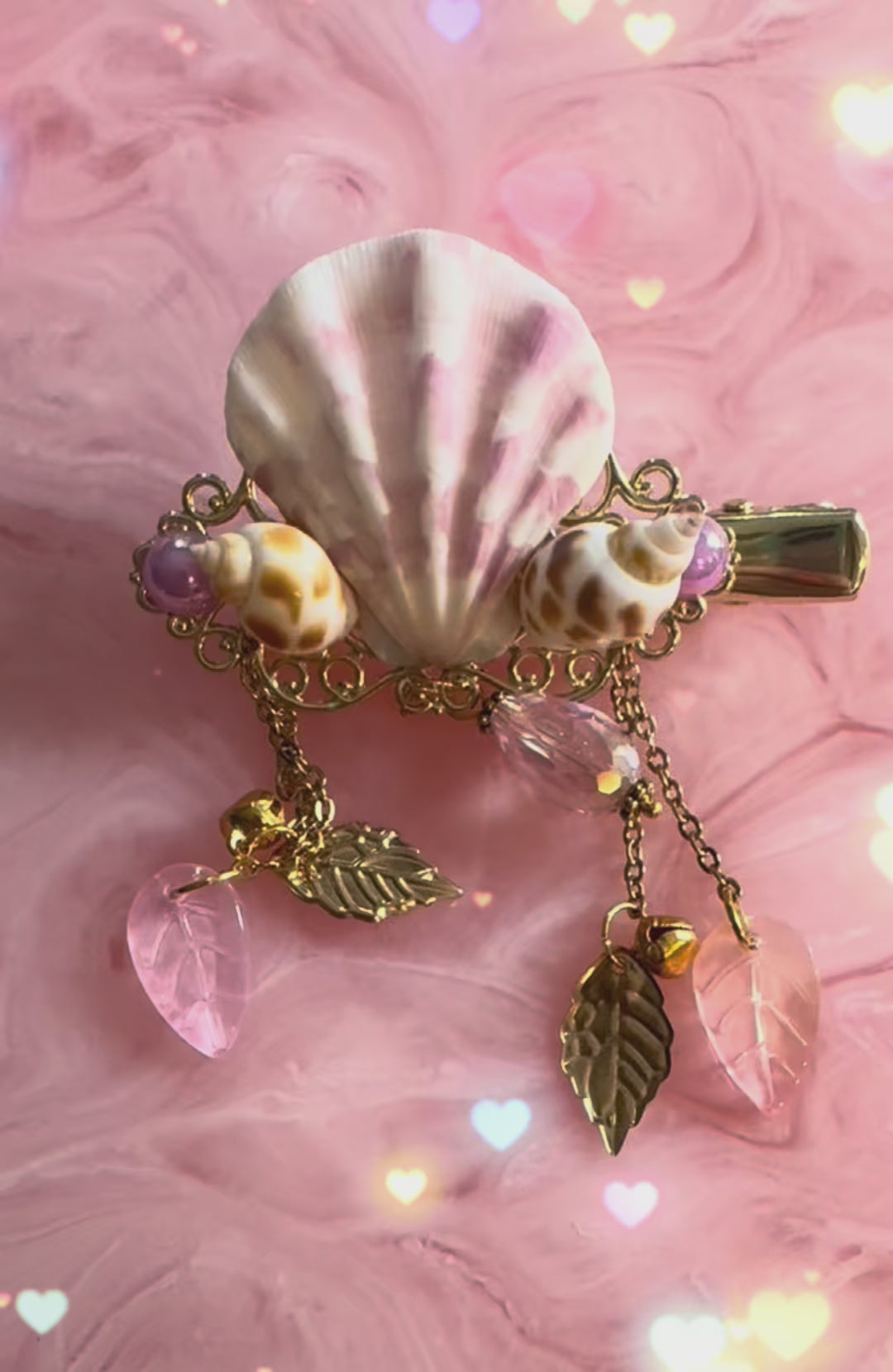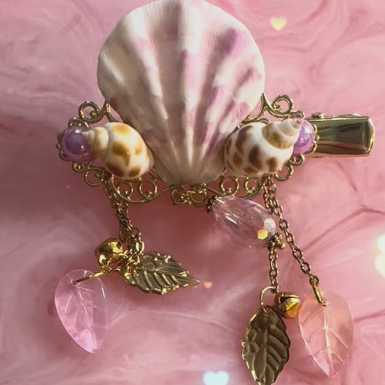 Delicate and ethereal, Sirens Jewels is a handcrafted 14K gold hair clip in dreamy shades of pale pink, adorned with glistening glass leaves and crystals that catch the light with every movement. The feature shell is truly unique and I doubt I will ever find another quite this magnificent. Whether worn every day or on a special occasion, it adds a whisper of enchantment to your look.
