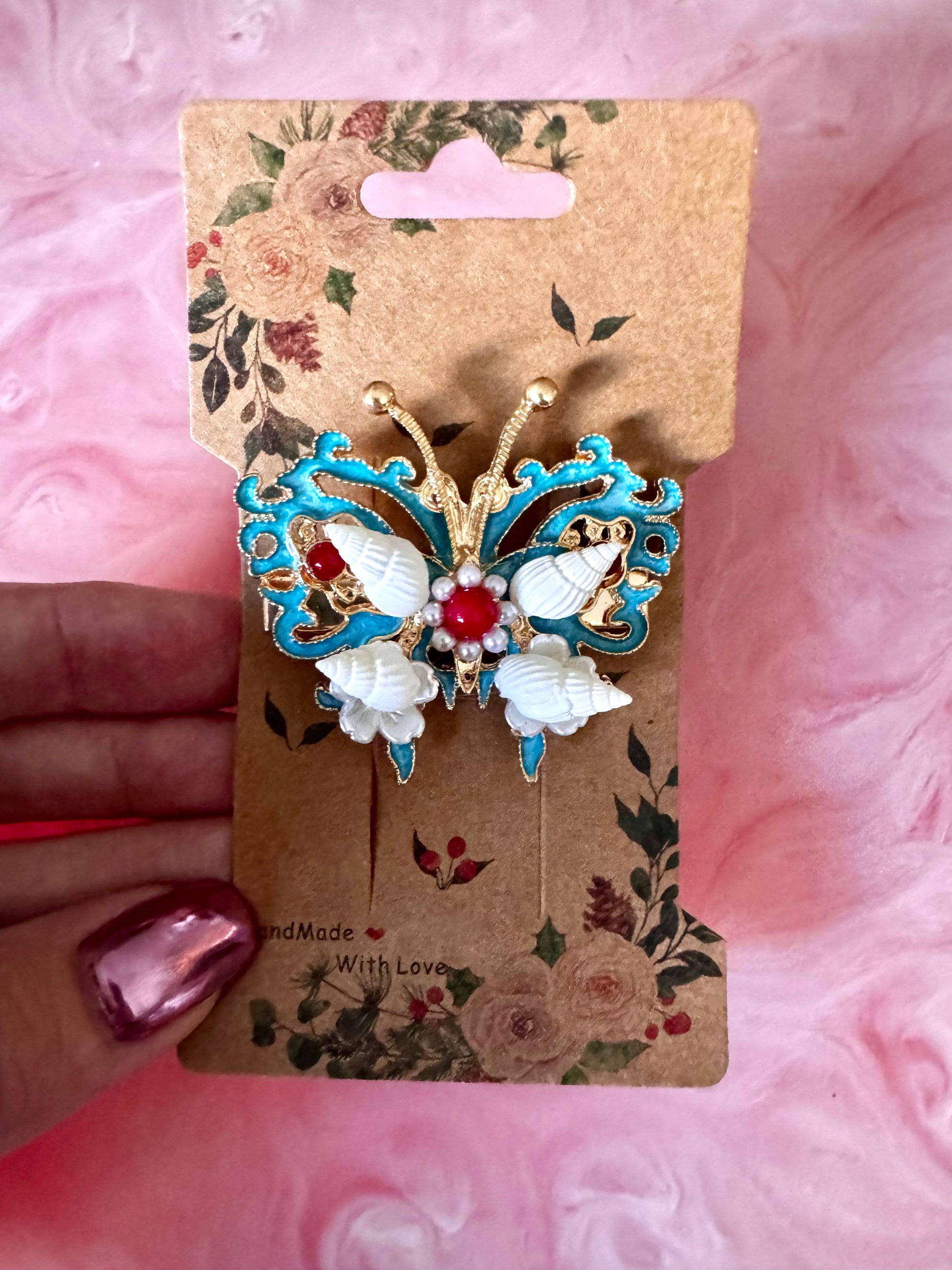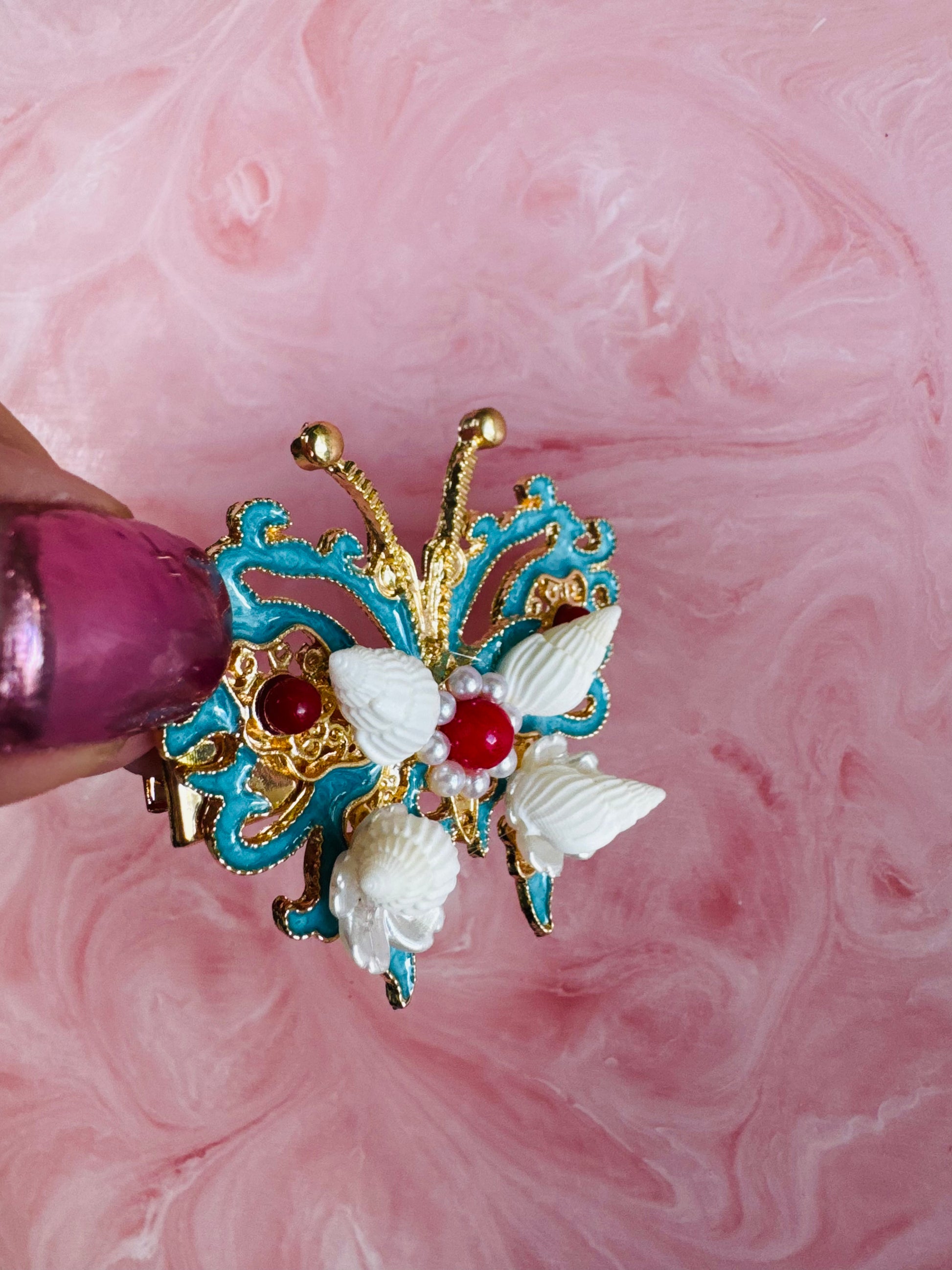 Blue butterfly featuring real shells on a metal hair clip.