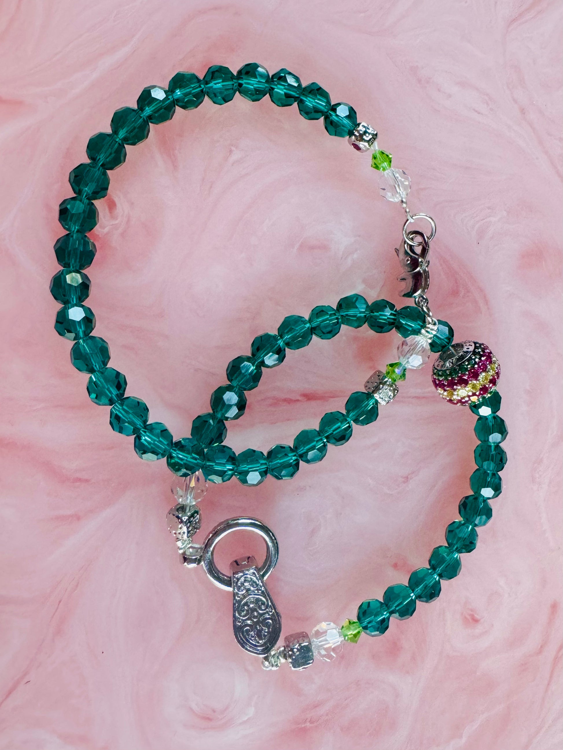 Stunning Handmade Craftsmanship Emerald Green Crystal bracelet ~ featuring easy to close silver clasp, TINYSAND Rondelle Rhodium Plated 925 Sterling Silver European Bead covered in stunning Czech crystals, and silver beads with Pave Setting Colourful Cubic Zirconia set into Platinum. Tinysand charm retails for around $90 alone. This is a truly STUNNING bracelet. Size is 18.5cm in length & will fit most wrists ~ however please notify me if you require a custom size.