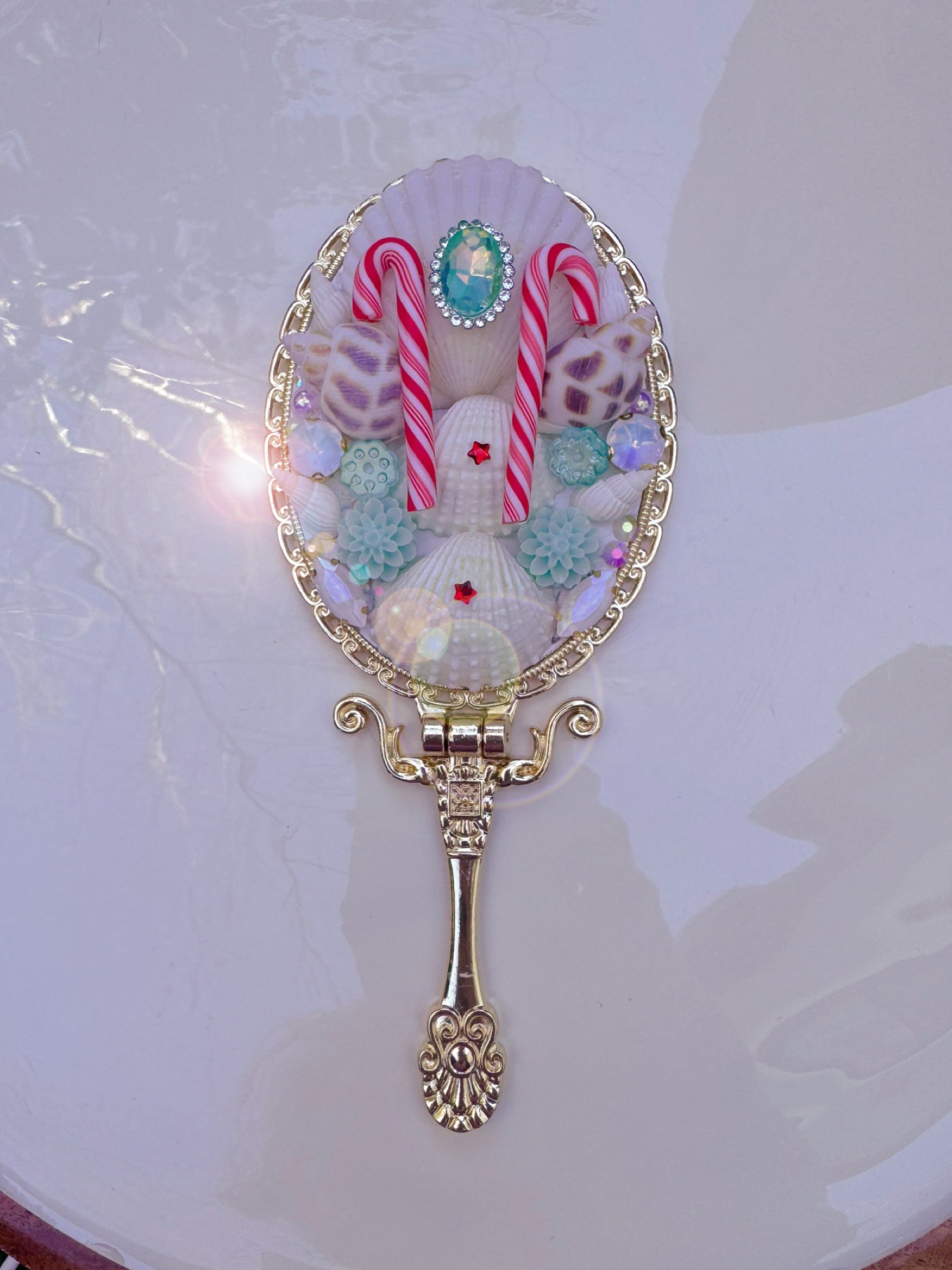 “Peppermint Seas" 🎄✨A Christmas treasure like no other. This mirror is adorned with peppermint swirls of red, white, and shimmering crystal, where handmade candy canes dance among seashells from the sea. A joyful blend of coastal beauty and festive cheer, it’s a piece that sparkles with the magic of Christmas while remaining utterly one-of-a-kind.