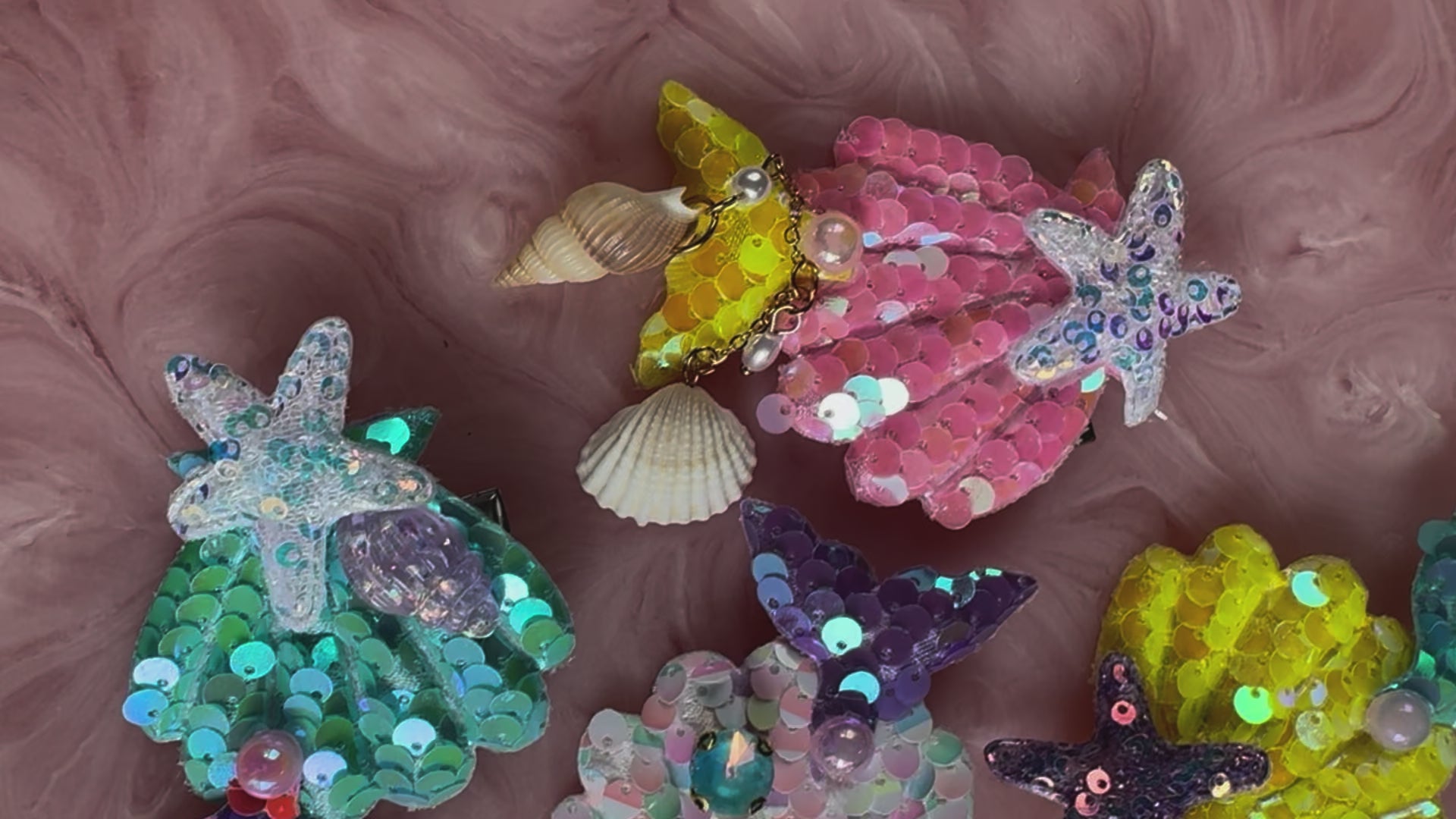 Sequins, shells, and sparkle.. everything a little mermaid needs. Choose from a variety of colours and styles. Easy clip back. All approximately 8cm in length.