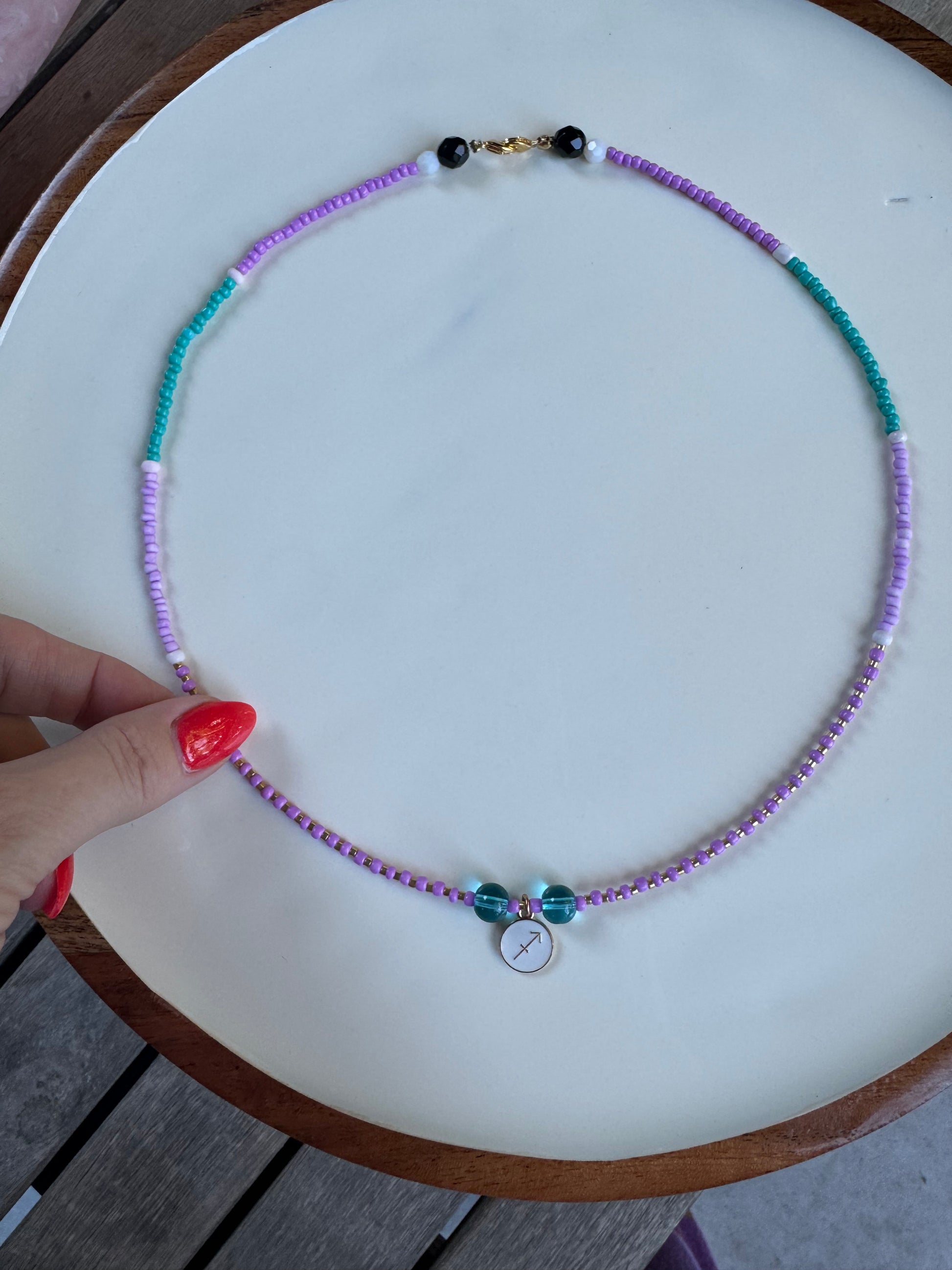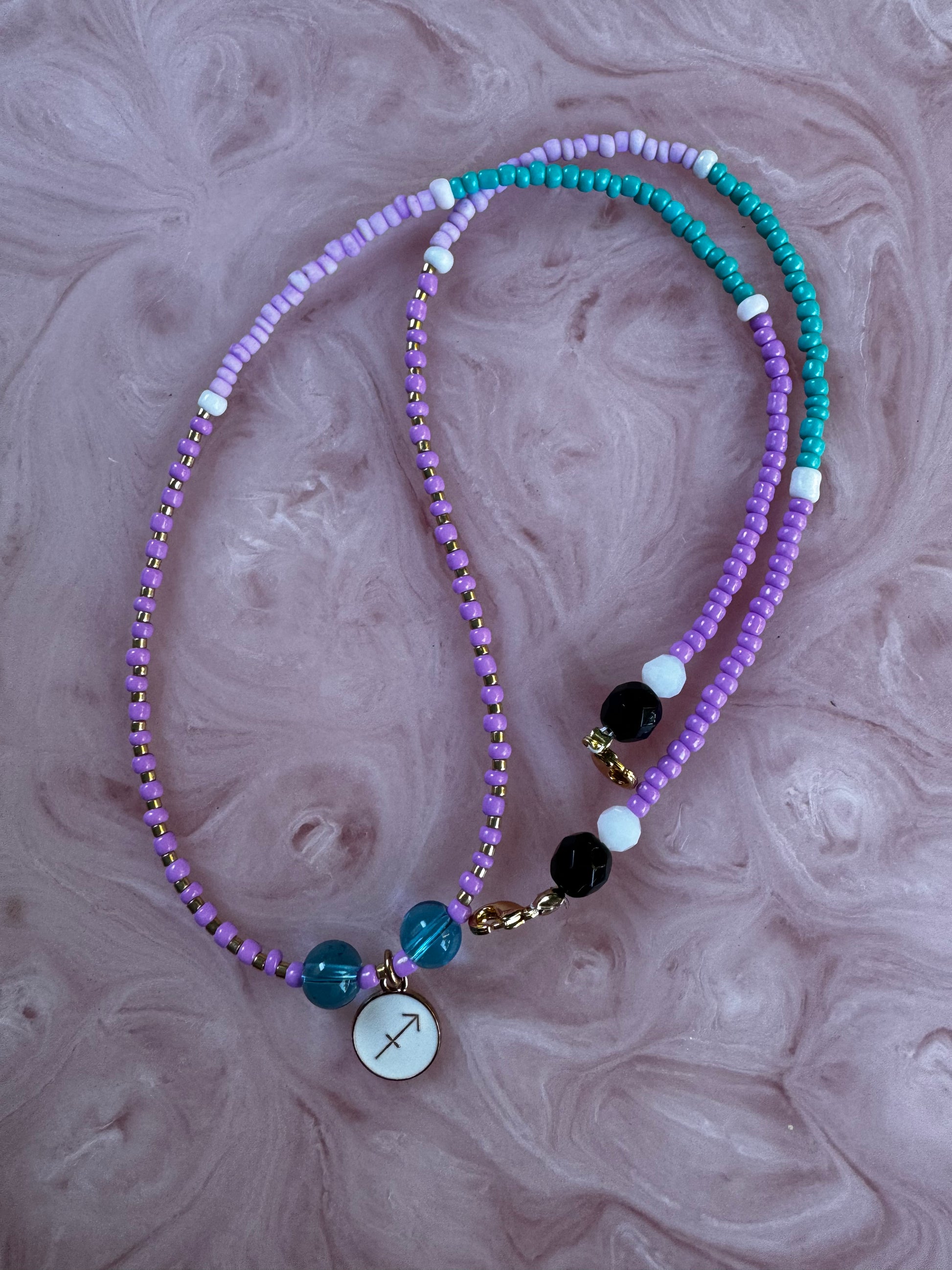 Handmade Japanese beaded necklace featuring 24 carat gold spacer beads and customised zodiac symbol.