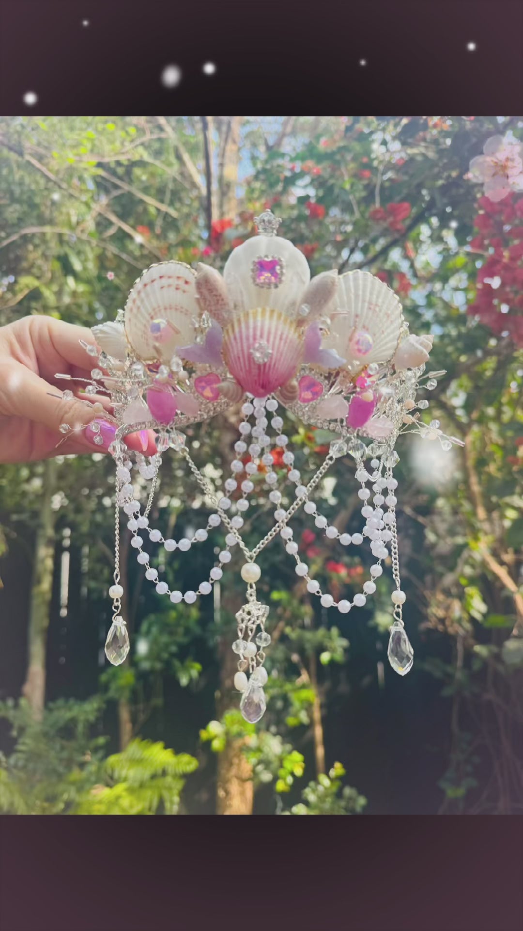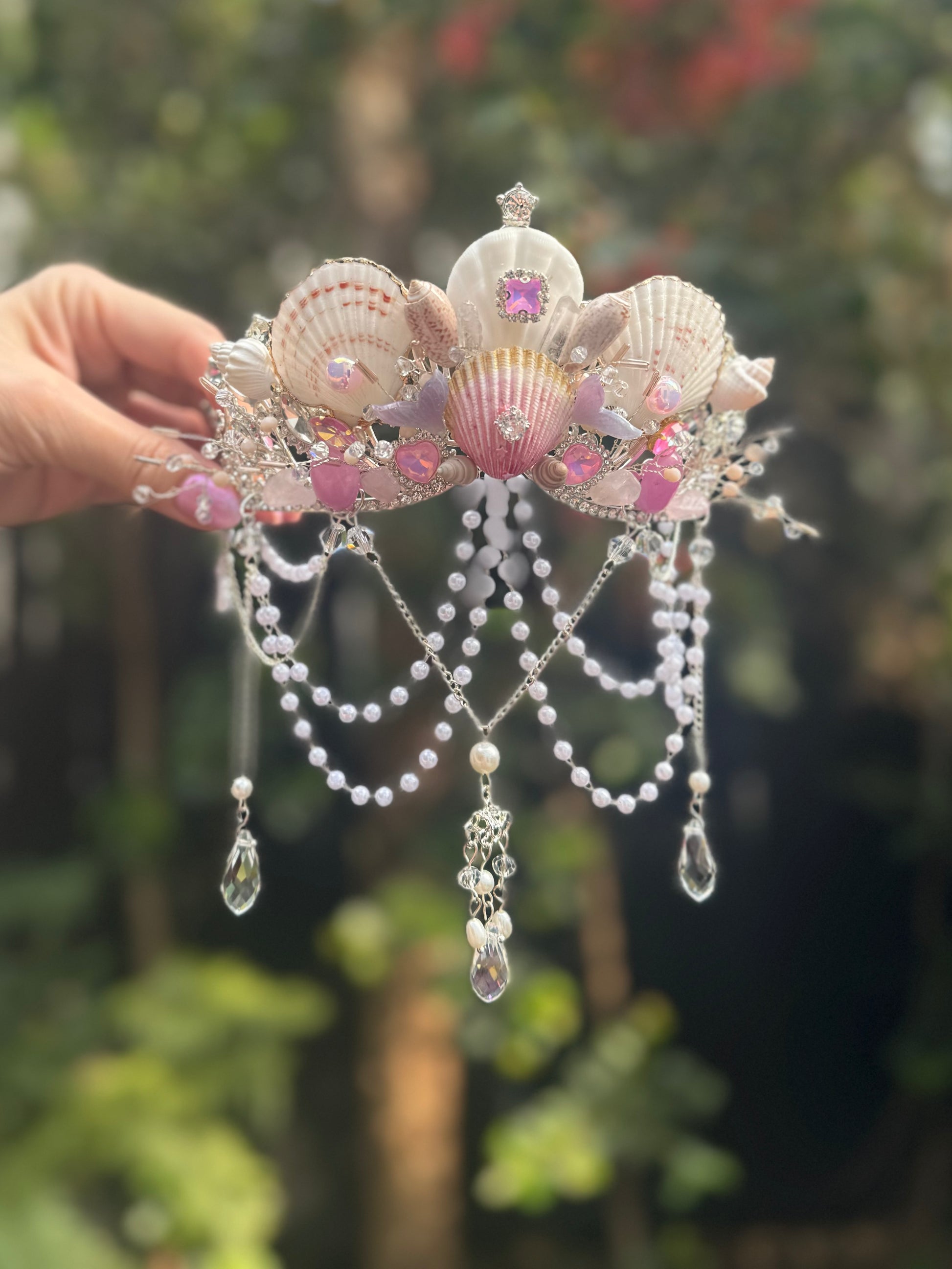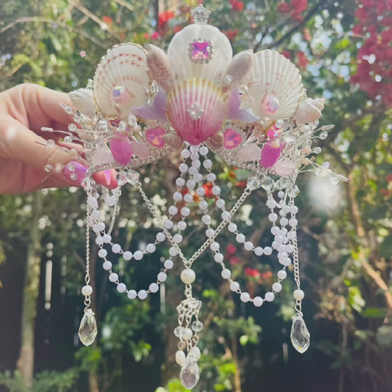 Step into a world of ocean enchantment with this one-of-a-kind Mermaid Fantasia Crown. Handcrafted with care, it features delicate seashells kissed in soft pink tones, shimmering details, and ethereal accents that capture the magic of the sea.