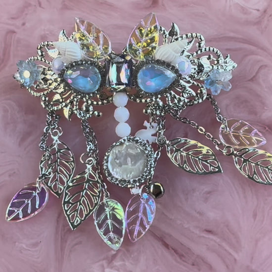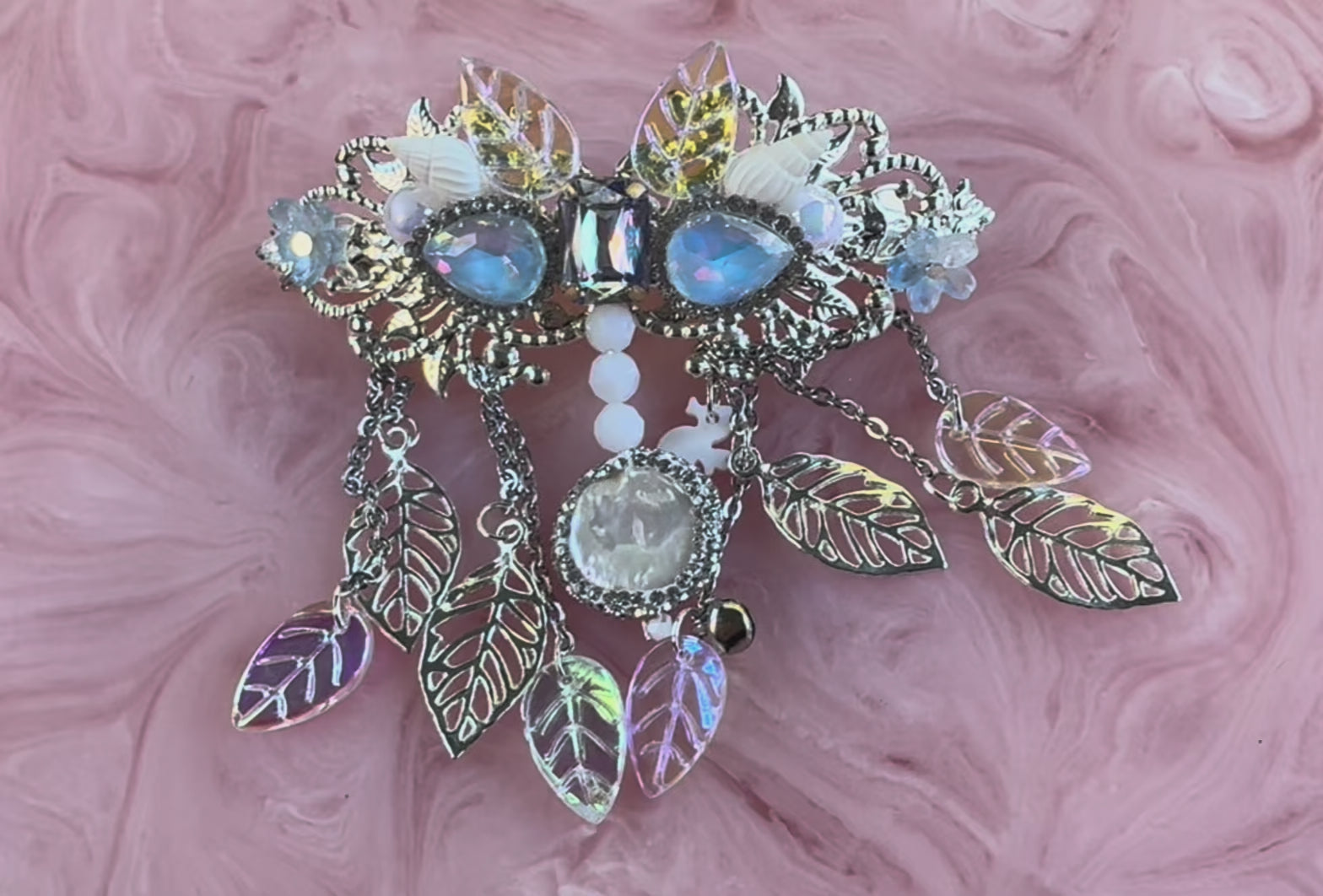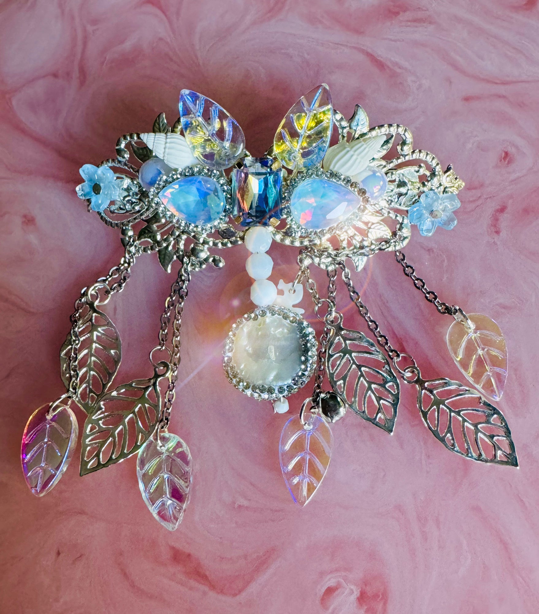 features genuine pearl centrepiece, real seashells, glass leaves, Czech crystals and intricate handmade details.