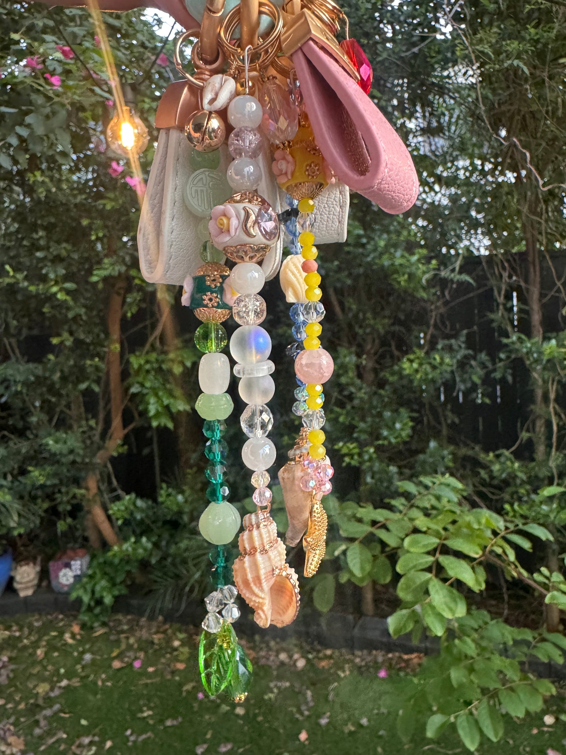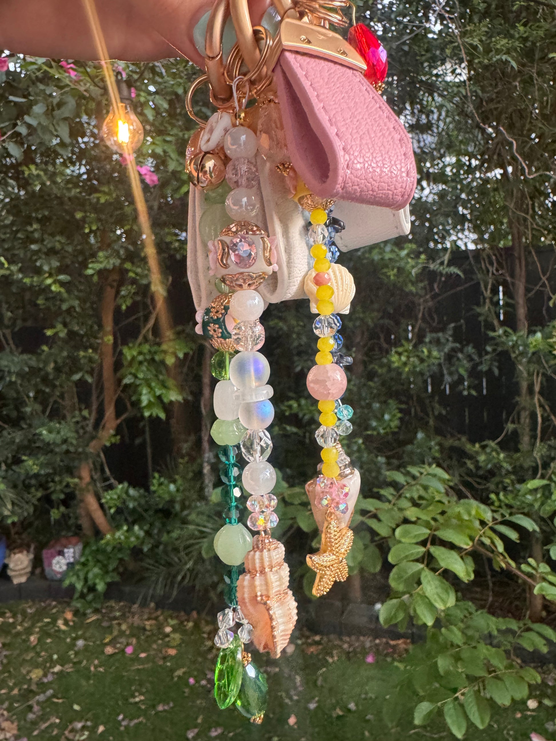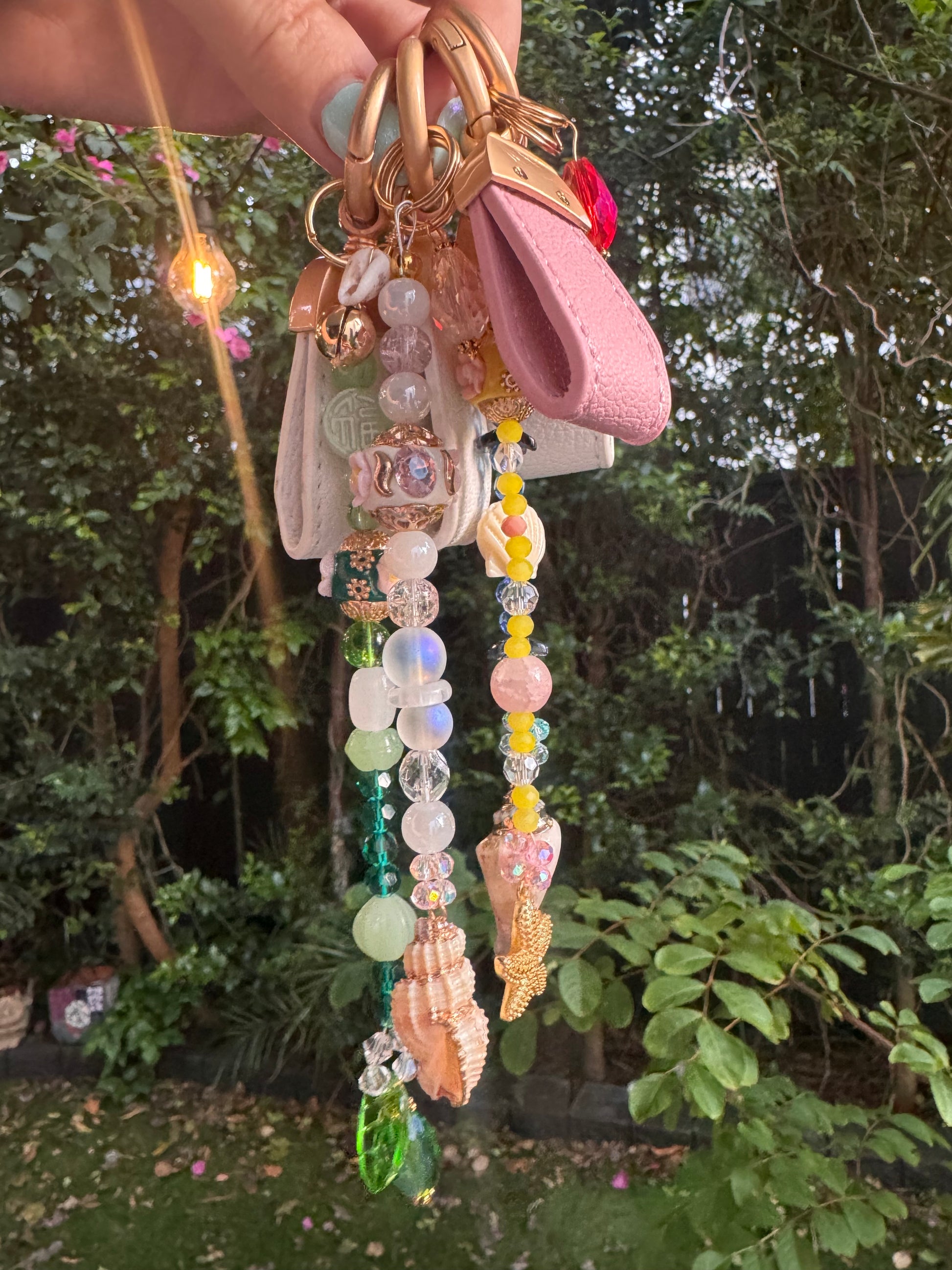 Handmade beaded bag charms that can also be used as a keyring. Featuring our signature seashells, genuine Czech crystals and easy to open/close brass gold handbag / key clasp.