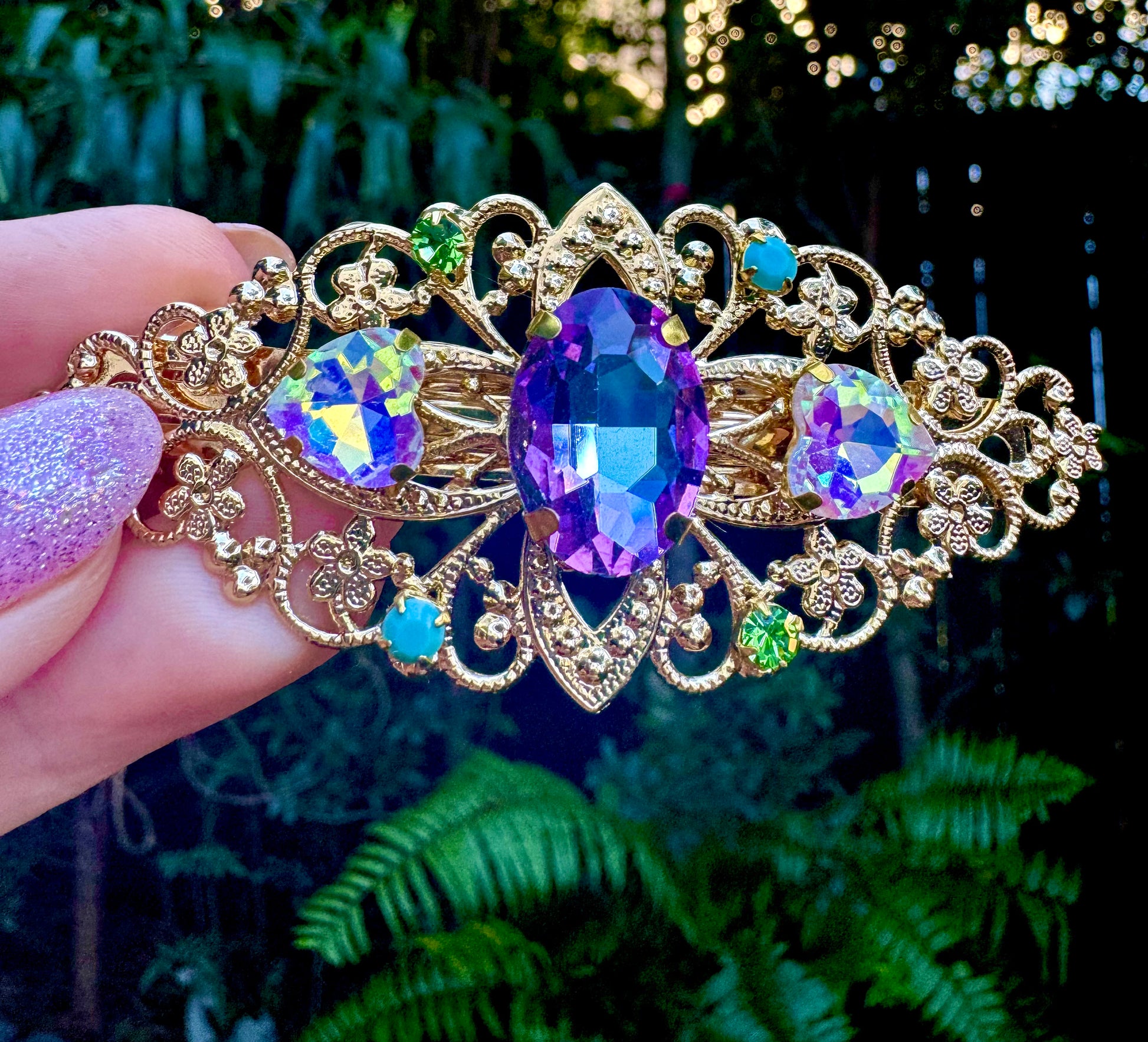 Queen Amara hair accessory with rich gold base and glimmering Czech crystals in purple, pale green, and turquoise, this piece feels like it belongs to a queen from a forgotten empire. Made for those moments when you want to feel completely radiant.✨