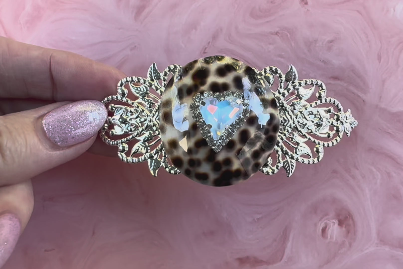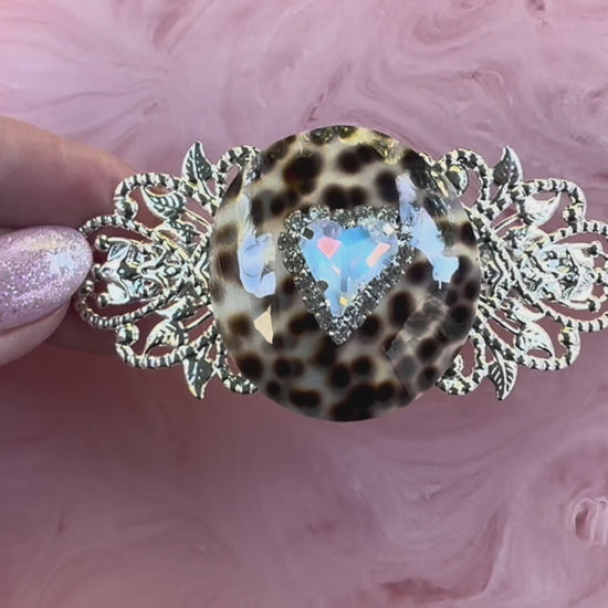 Where wild meets celestial. This hair clip features a natural cowrie shell adorned with crystals, set against a sleek silver base. With subtle animal print vibes and a touch of jungle magic, Starlit Jungle ~ fierce, free, luminous.