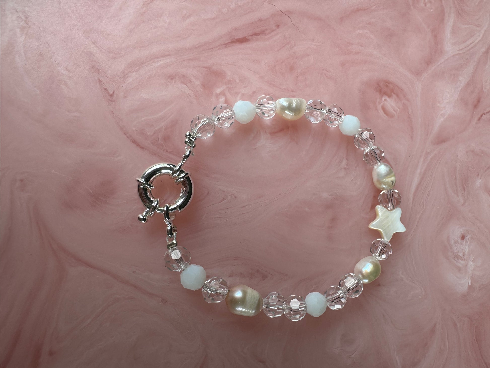 Crafted with luminous pearls, shimmering star shell, and clear crystals, this bracelet captures the serene beauty of the sea in shades of pure white and glistening light. Finished with a sleek platinum silver clasp for effortless wear, it’s a piece that feels timeless yet ethereal. Elegant, ocean-inspired, and designed to let your natural glow shine through. 🌊🤍✨